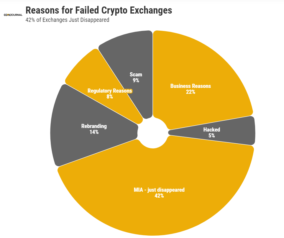 Среди основных причин можно выделить: давление со стороны регуляторов, взломы, неправильная стратегия развития площадки и конечно злонамеренный скам:
