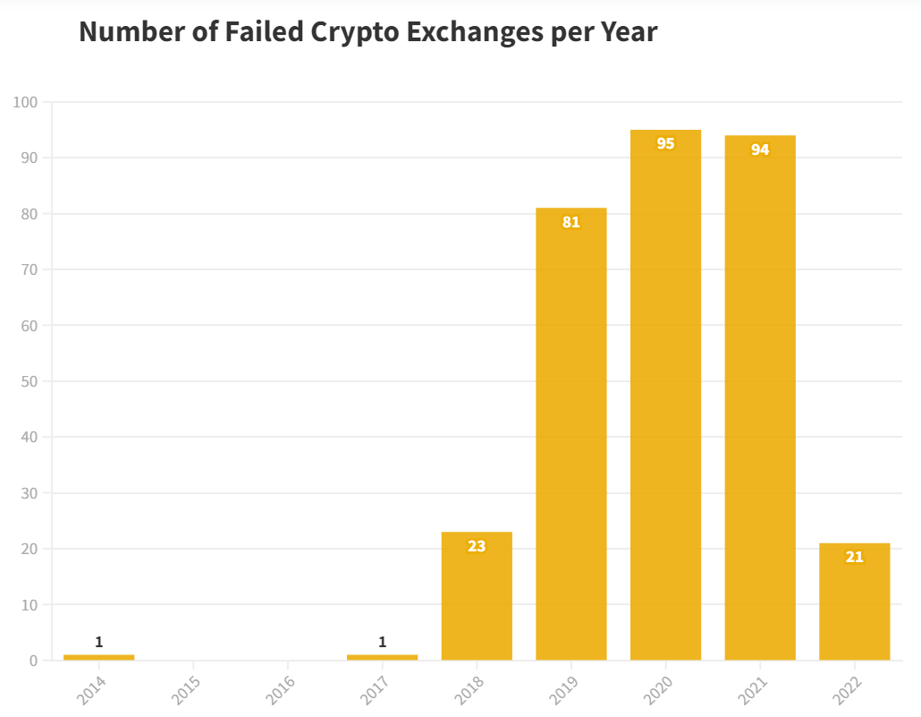 На днях криптанское издание Coinjournal представило отчет о количестве бирж, которые соскамились — как выяснилось с 2014 по 2022 год не менее 42% централизованных торговых площадок полностью прекратили работу и более не возвращались на рынок. При этом, за последние 4 года число банкротств значительно возросло: в 2018 году 23 биржи стали банкротами, в 2019 году данный показатель вырос на 252%, а в 2020 году еще на 17%: