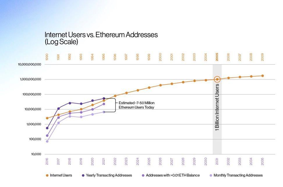 Мы все-еще на ранней стадии развития. Аналитики считают, что сейчас в Ethereum около 7-50 млн — именно столько пользователей было в Интернете к 1995 году. Если подобная тенденция сохранится, то к 2031 году у нас будет 1 млрд пользователей Web3 (расчет по аналогии с Интернетом 2005 года, когда начали зарождаться гиганты индустрии YouTube, Facebook).