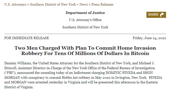 Согласно информации на сайте Министерства юстиции США, в штате Вирджиния арестовали двух людей, которые собирались вломиться в дом к инвестору, чтобы заставить его сообщить пароль от кошелька с десятками миллионов долларов в BTC: