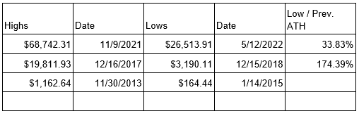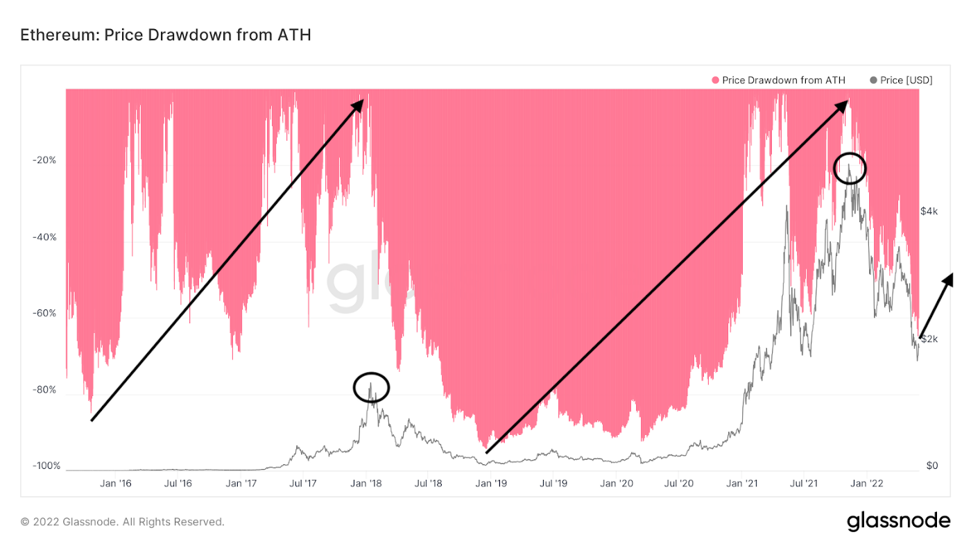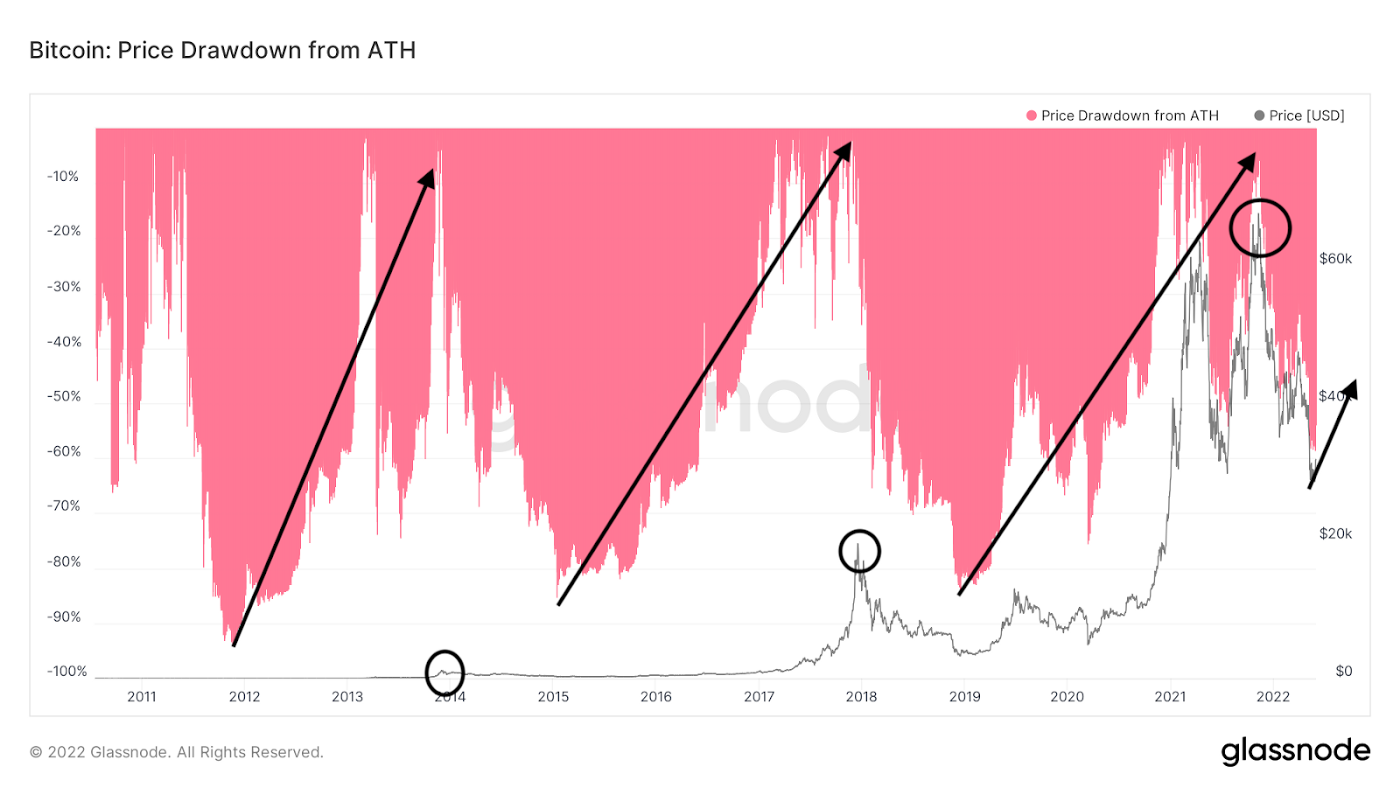 Хейс привел в пример график от Glassnode, который помогает осмыслить основные ценовые циклы BTC — локальное дно достигается при наибольшей просадке по сравнению с историческим максимумом предыдущего цикла (ATH):
