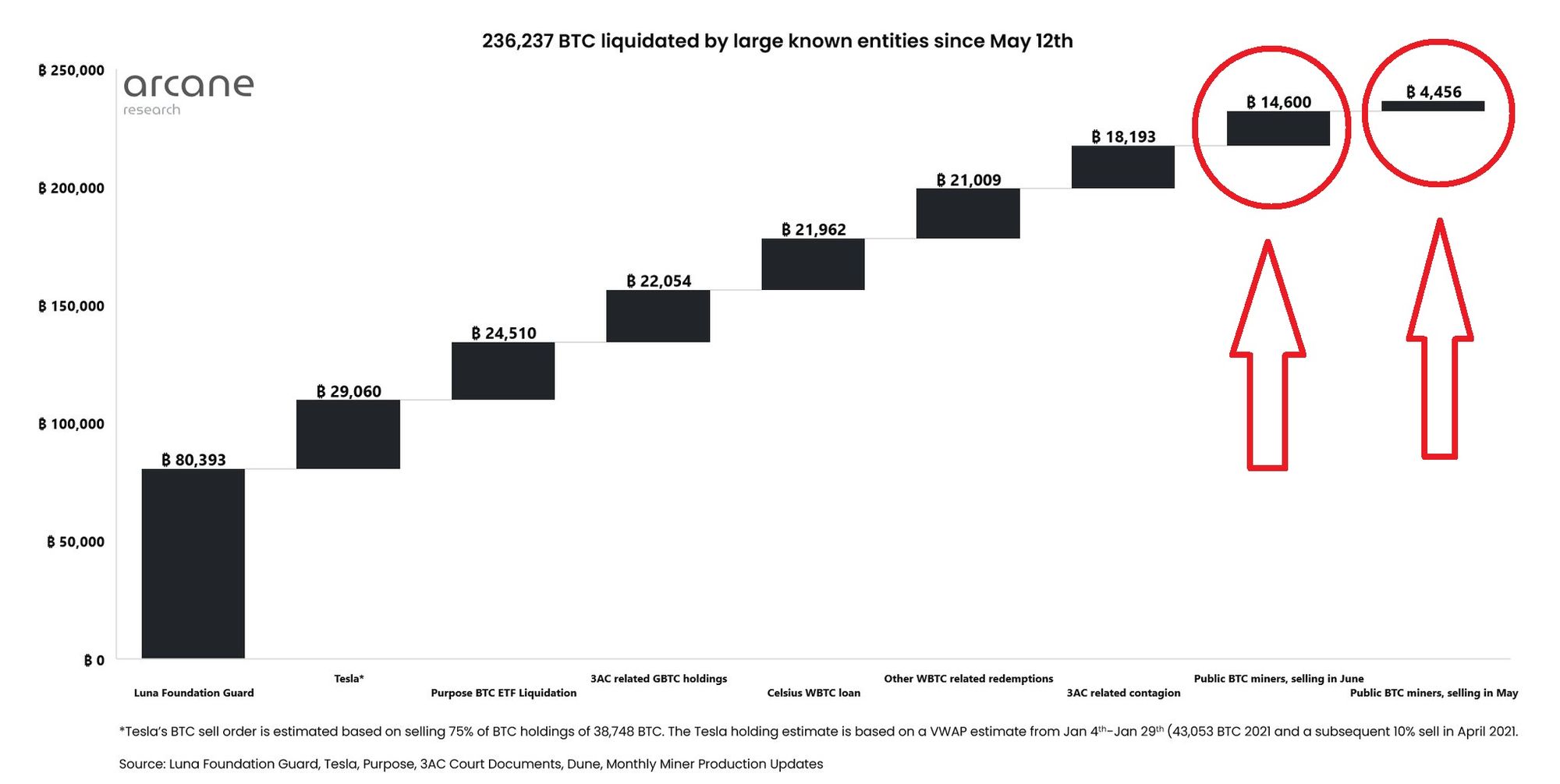 Криптокризис очень сильно ударил не только по лендинговым компаниям и мелким криптобиржам, но также и по майнерам. Как сообщают аналитики Arcane Research, в период с мая по июнь 2022 года из запасов майнинг-компаний было продано ~19 056 BTC: