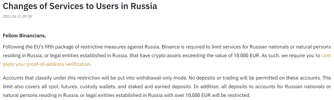 В соответствии с пятым пакетом санкций ЕС против России, Binance вводит санкции против граждан РФ — ограничения коснутся всех российских клиентов торговой площадки, общая стоимость криптоактивов которых превышает €10 000, они смогут только выводить средства.