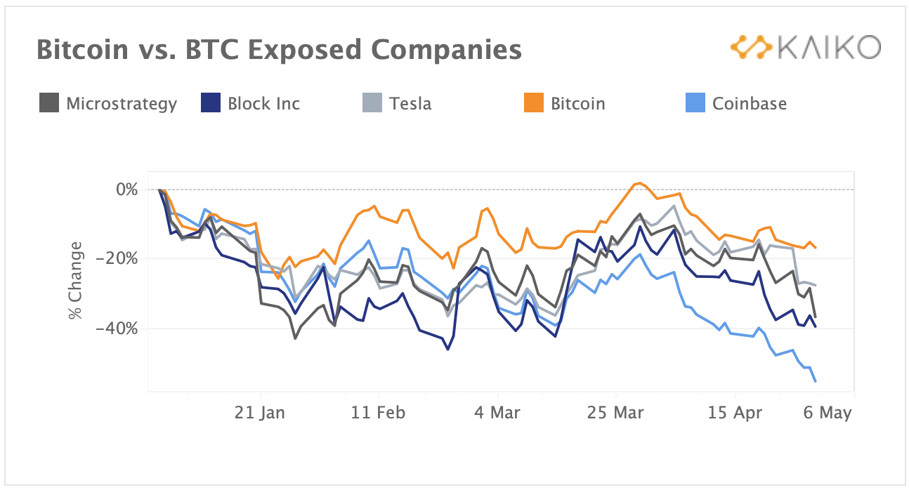 Аналитики Kaiko опубликовали новый отчет, где заявили, что несмотря на близкую корреляция BTC с публичными компаниями (достигла многолетнего максимума 0.8), первая криптовалюта показала себя значительно лучше с начала 2022 года, нежели котировки крупных компаний, связанных с криптоиндустрией (крипто компании, или компании, которые держат на балансе цифровые активы).