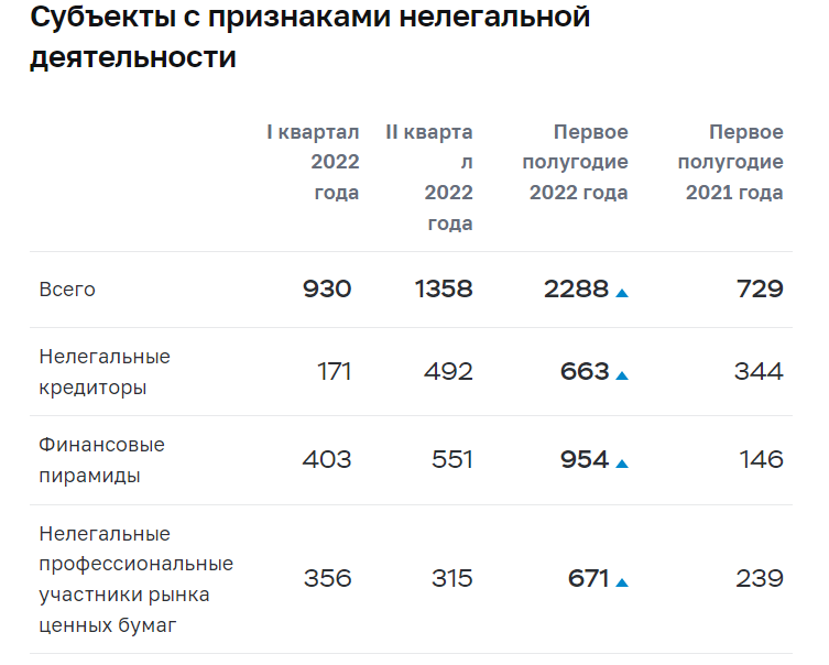 Продолжился рост количества проектов, предлагающих инвестиции в криптовалюты и псведокриптовалюты — в первом полугодии 2022 года более 56% финансовых пирамид (537 субъектов) привлекали средства в различных криптовалютах либо рекламировали вложения в криптовалютные активы.
