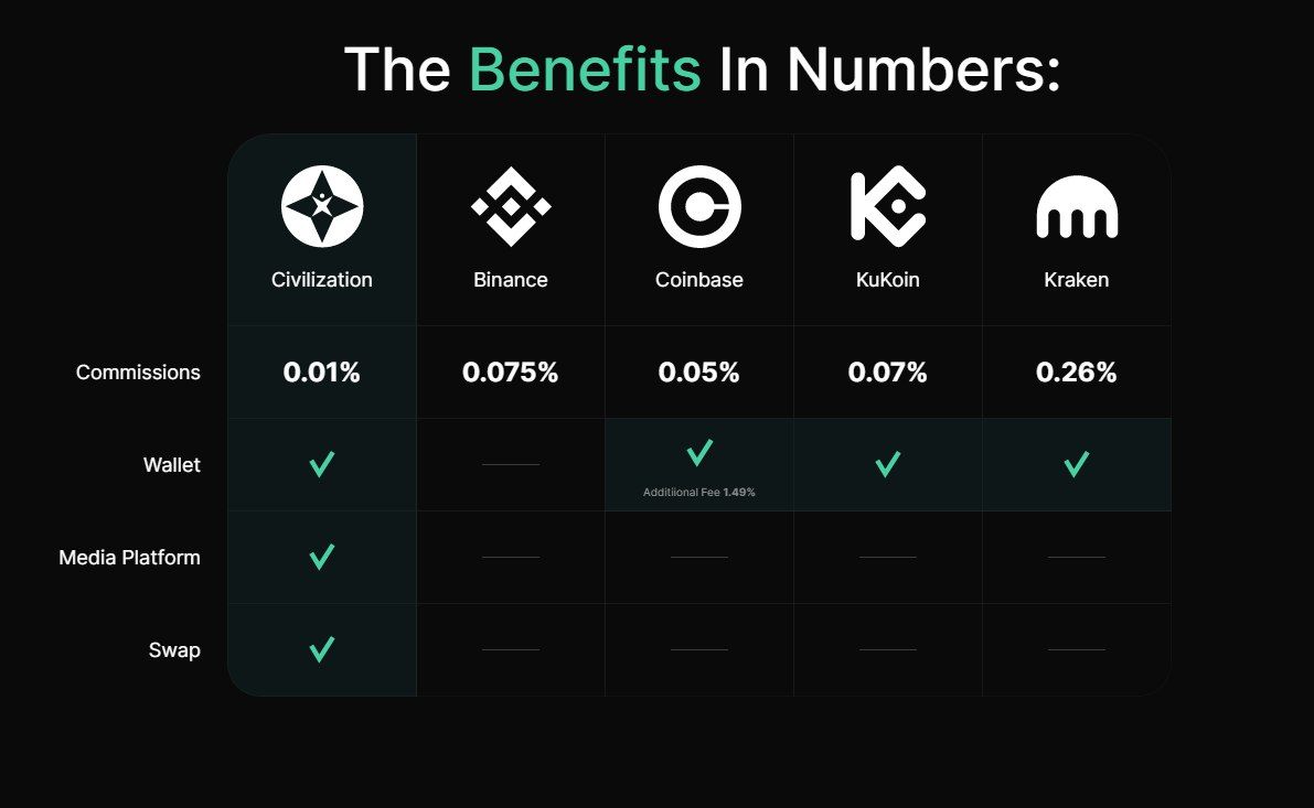 На сегодняшний день у Civilization Network самые низкие комиссии в мире — 0.01%, что ниже, чем у любой CeFi или DeFi биржи: