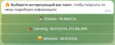 Также на данный момент токены CVL можно купить по очень выгодным ценам, и положить в фарминг под 273.6% годовых (все это можно сделать через бот):