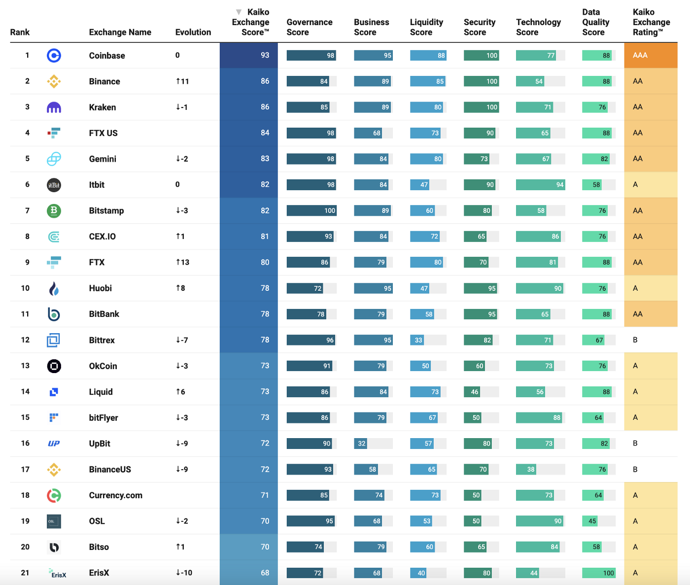Kaiko ранжирует криптовалютные биржи на основе взвешенной совокупности индивидуальных оценок по шести критериям: управление, бизнес, технологии, качество данных, безопасность и ликвидность. Оценка управления получает наивысший вес (30%) в композите.