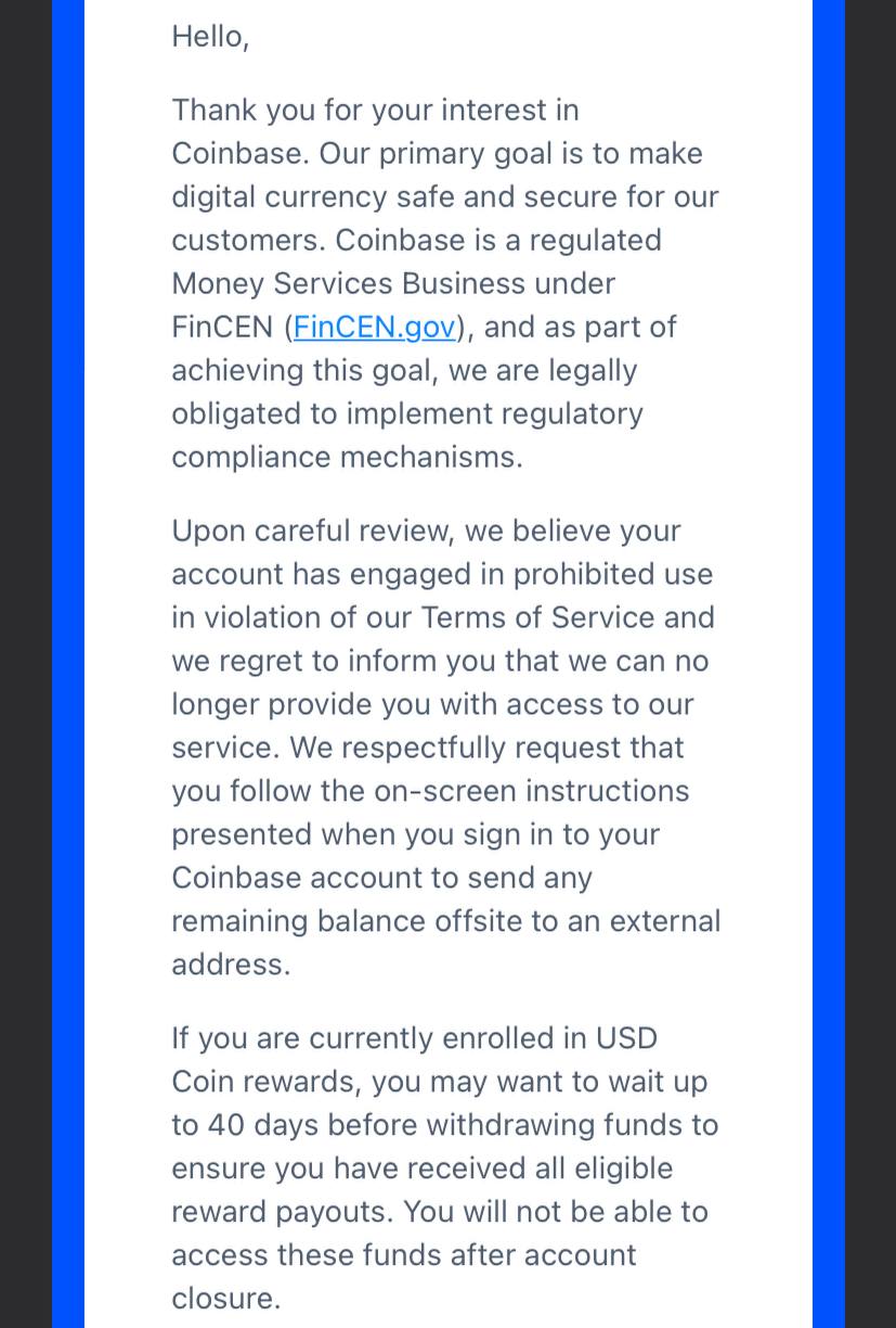 Биржа Coinbase закрыла мой аккаунт за «запрещённые цели». Только вот я никогда не пользовался этой учёткой.