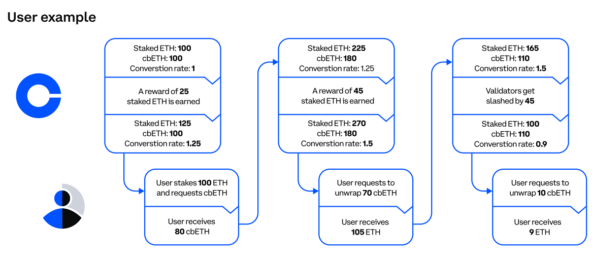«ETH и cbETH не привязаны и не должны быть взаимозаменяемыми. Фактически, по мере того, как базовый ETH продолжает получать вознаграждение, каждый токен cbETH, как ожидается, будет представлять большее количество ETH, что может привести к расхождению цен на эти активы с течением времени».