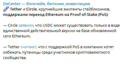 Интересный факт: Tether, эмитент стейблкоина USDT, одним из первых заявил о поддержке обновления Ethereum: