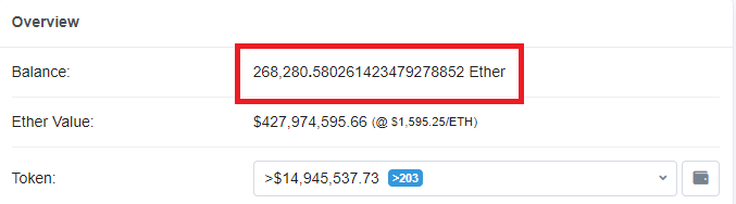 Всего Джастин Сан хранит на своем кошельке 268 280.58 ETH на сумму $428 млн: