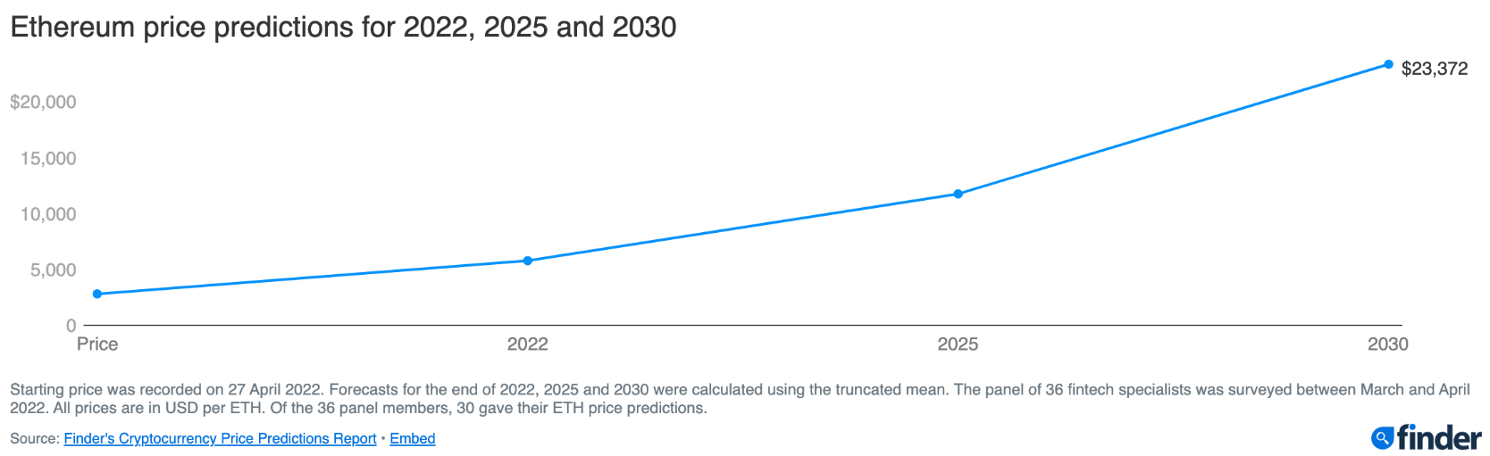 Согласно опросам экспертов компании, 2022 год Ethereum может завершить на уровне $5783, к 2025 году вторая криптовалюта может достигнуть $11 764, а к 2030 году — $23 372.