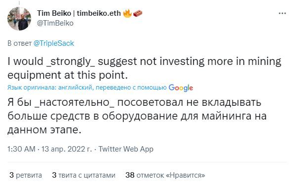 Тим Бейко также порекомендовал Ethereum-майнерам не инвестировать средства в новое оборудование: