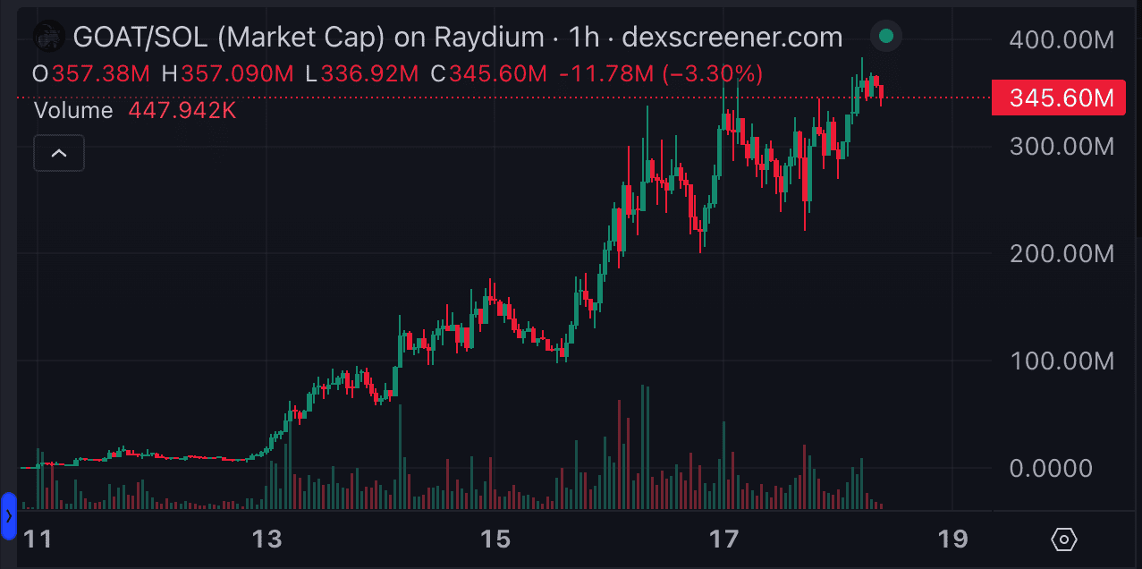 GOAT — мемтокен, созданный в Solana 10 октября 2024 года. По данным DEX Screener, его капитализация за первые 10 дней выросла до $387 млн.