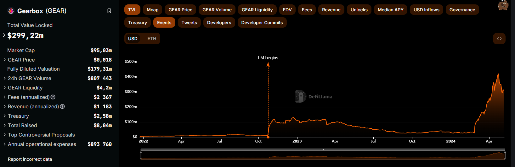 На момент написания объем заблокированных средств (TVL) в смарт-контрактах Gearbox демонстрирует рост, составляя более $299 млн: