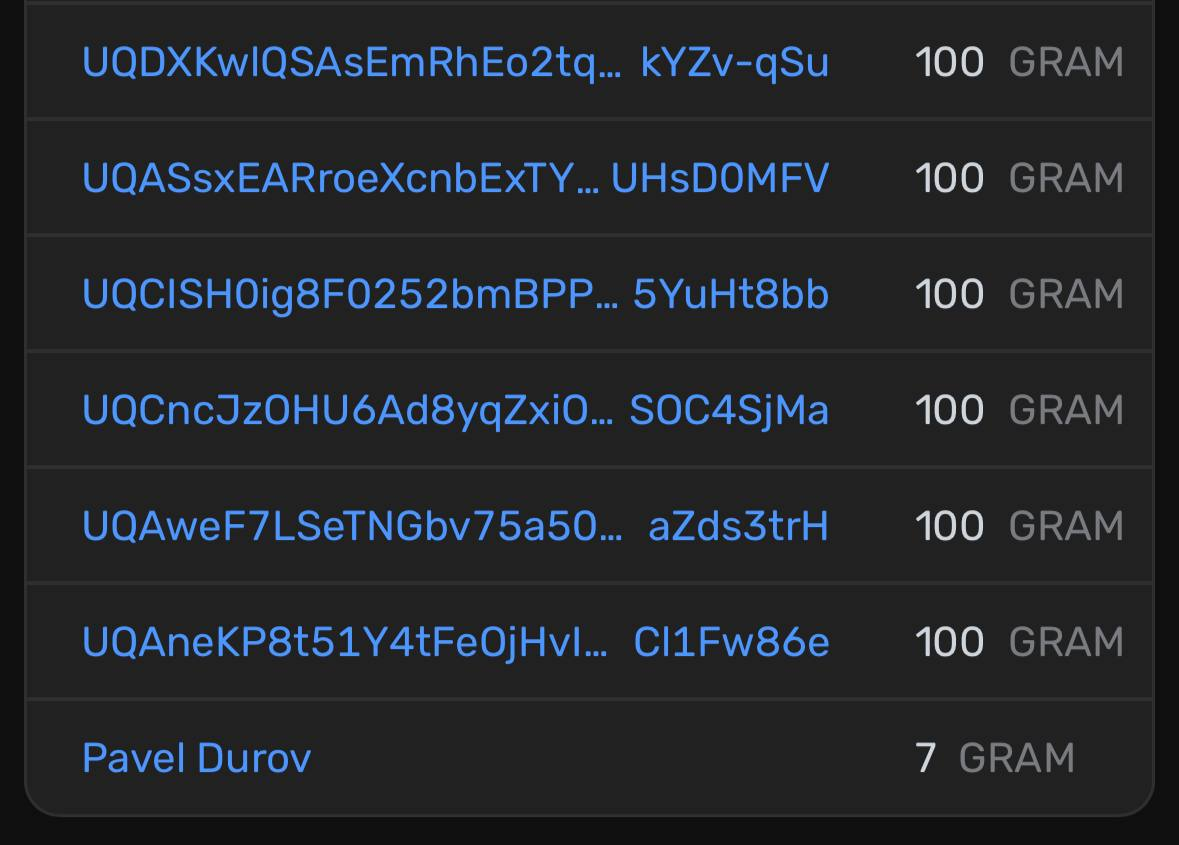 Кажется, кроме названия и общего блокчейна проект никак не связан с создателем Telegram, но неизвестные участники сообщества перевели на публичный кошелёк Павла транзакцию в 7 GRAM, что сделало его держателем с самым маленьким балансом этой монеты в блокчейне.