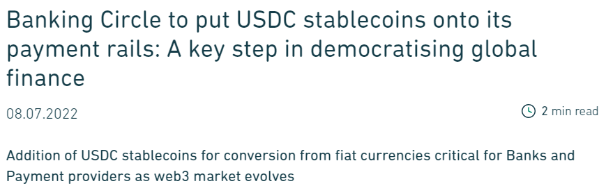 На своем официальном сайте, европейский банк Banking Circle, который специализируется на трансграничных платежах, заявил, что они начали принимать стейблкоин USDC в качестве метода обработки и расчета платежей — мастодонт криптоиндустрии Coinbase станет одним из поставщиков ликвидности для банка.