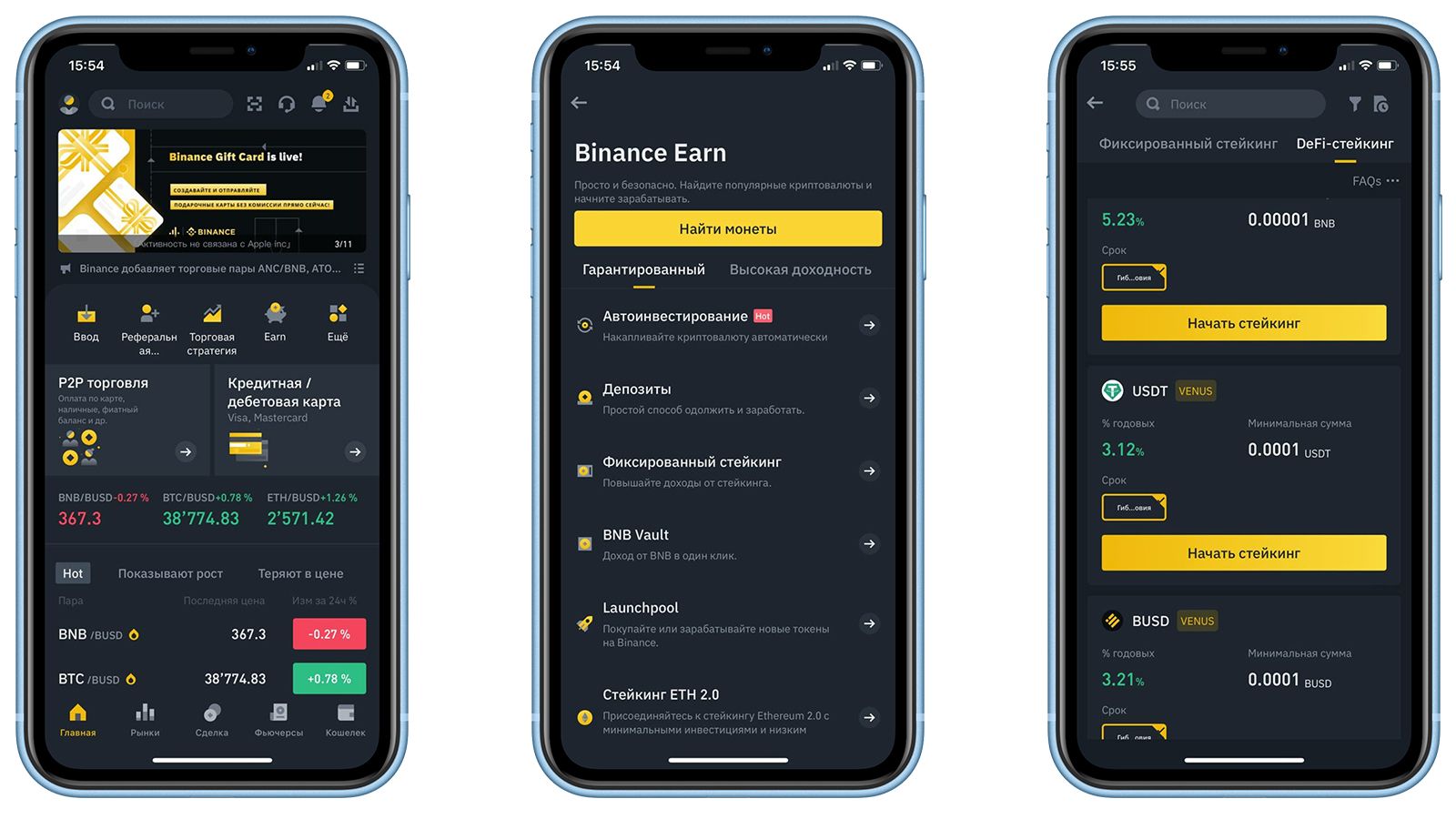 Криптобиржа Binance гарантирует стабильный годовой APY от 2,79% до 3,21% при удержании токенов BUSD, USDCи USDT. Для запуска стейкинга необходимо зарегистрироваться и пройти KYC.