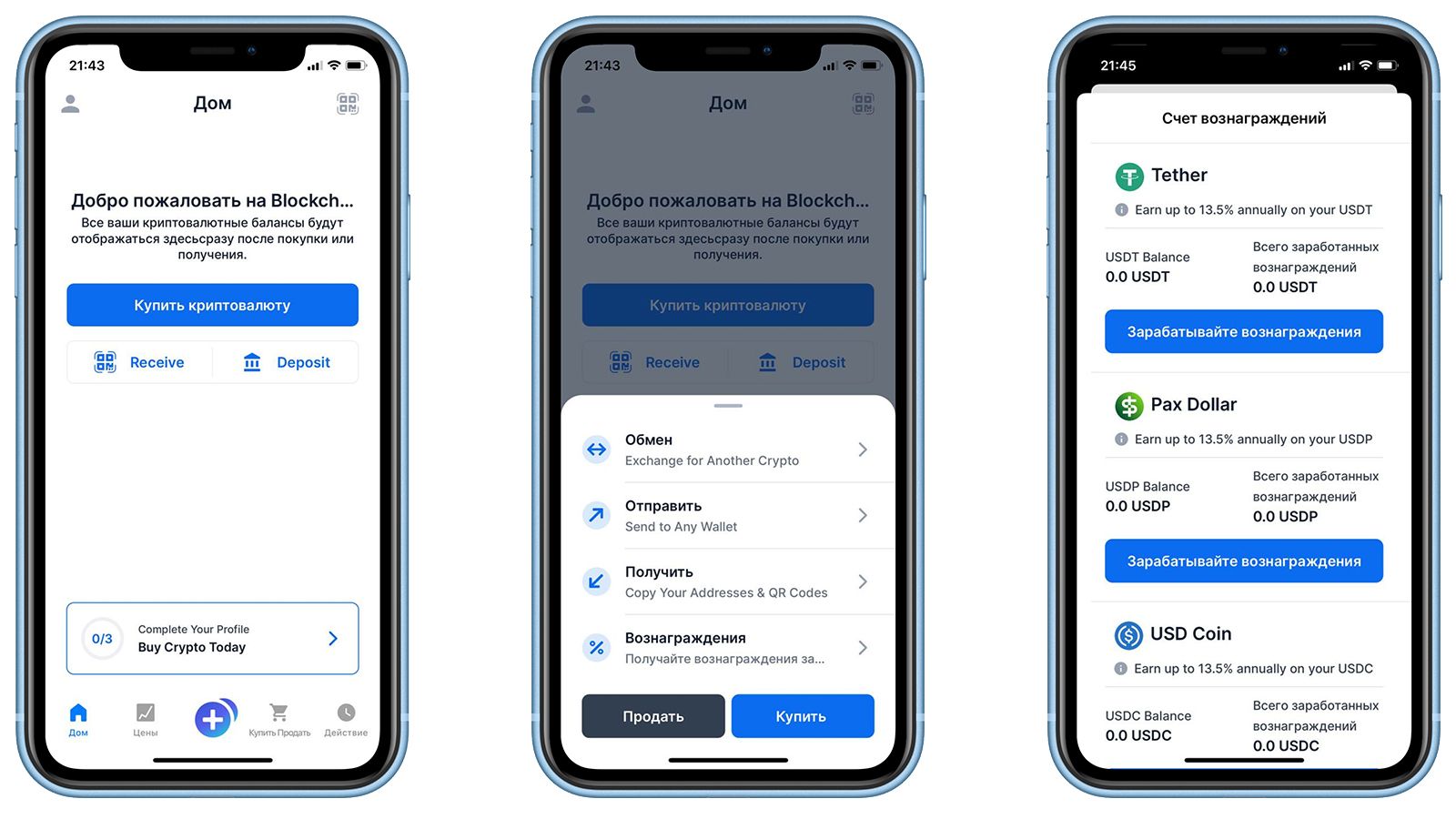 В приложении Blockchain, после прохождения верификации кликаем +, после чего предлагается совершить действия с монетами, покупаем или переводим криптовалюту в кошелек. Нажимаем Вознаграждения, где можно изучить предлагаемый на платформе стейкинг. Для отправки стейблкоина в удержание кликаем Зарабатывайте вознаграждение и принимаем условия.