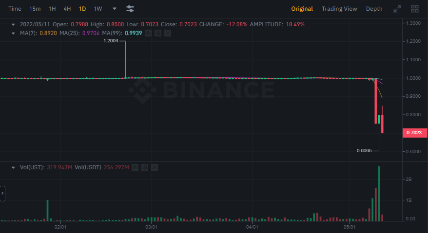В алгоритмического стейблкоина UST дела также обстоят не лучшим образом — после временного роста до $0.95, токен обвалился до $0.76:
