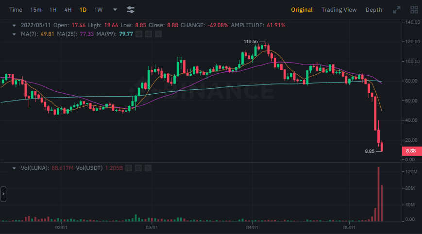 Стоимость LUNA сегодня упала ниже $10 — это обвал на более чем 90% от апрельского максимума в $119:
