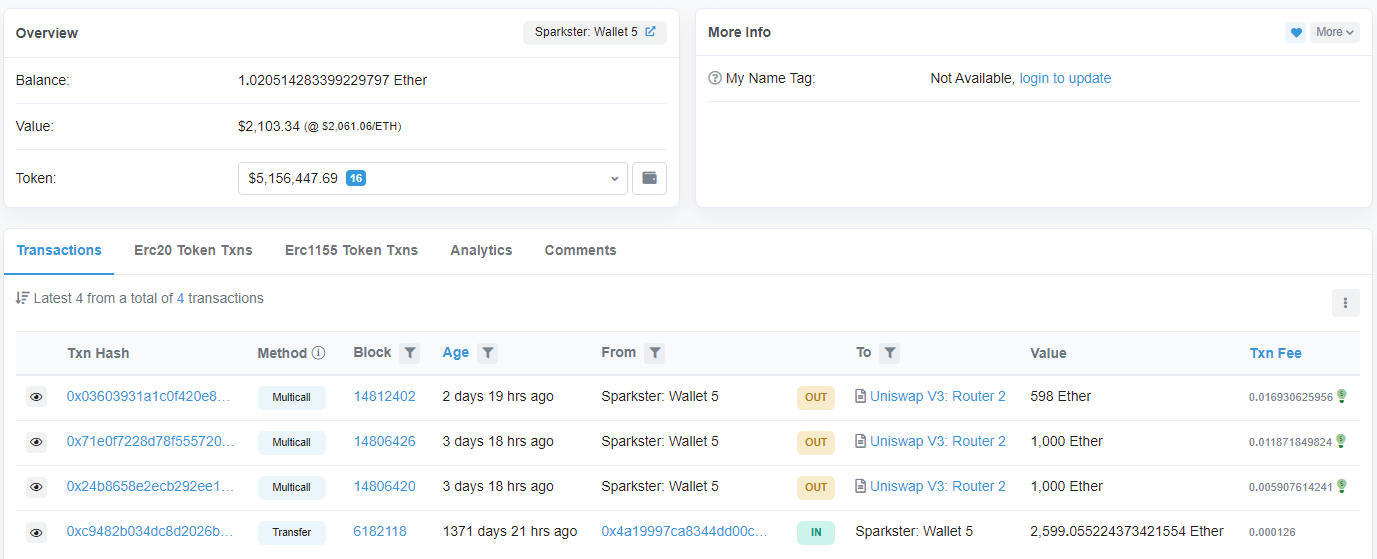 Согласно информации в блокчейне, на этих выходных средства в Ethereum с нескольких кошельков Sparkster были переведены в USDC через биржу Uniswap: