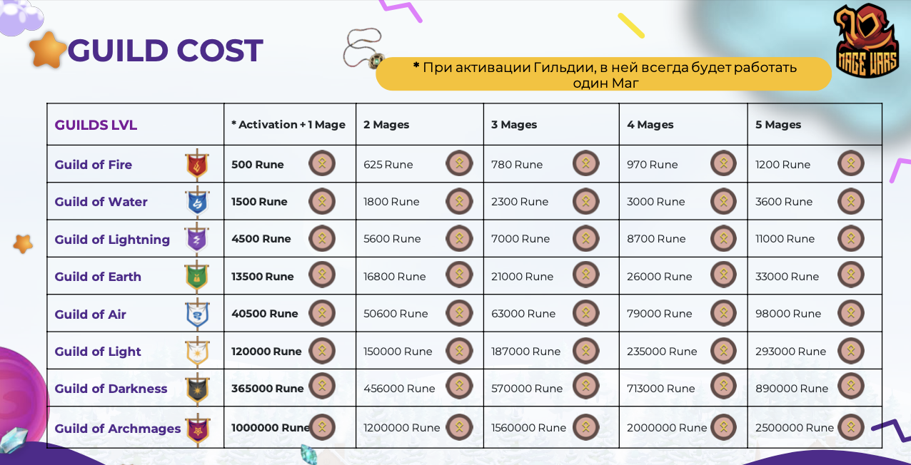 Руны являются внутренней валютой игры, с помощью которой можно создавать гильдии, нанимать магов, прокачивать Алтарь Маны и участвовать в боях на Арене. Мана также является внутренней валютой, с помощью которой игроки могут обменивать свой профит на Руны или BNB.Существует 8 разных классов магов: гильдия Огня, Воды, Молнии, Земли, Воздуха, Света, Тьмы и Архимаги. Чем выше уровень гильдии, тем больше маги собирают ману. В одну гильдию можно нанять максимум 5 магов.