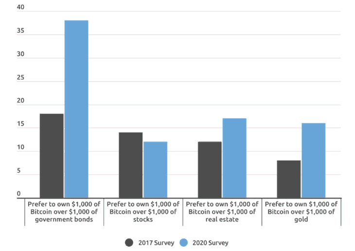 За три года увеличилось количество людей, предпочитающих биткоин традиционным активам. Более 45% опрошенных предпочли бы иметь биткоин вместо акций, недвижимости и золота — это на 13% больше, чем в 2017 году. Причем среди миллениалов их доля составляет 92% — против 68% ранее.