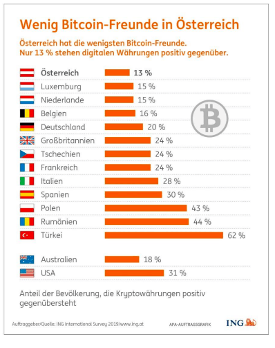 При этом исследование ING Group, проведенное в августе 2019 года и охватившее 12 стран, отметило ослабление веры людей в криптовалюты. Меньше всего доверяют биткоину жители Австрии — всего 13% против 20% в 2018 году, при том, что страна заняла первое место по осведомленности о первой криптовалюте. Лишь респонденты из Турции, Польши и Румынии сохранили оптимизм в отношении цифровых активов. Так, в Турции 62% опрошенных уверены в успешном развитии биткоина и 30% готовы получать в нем зарплату.