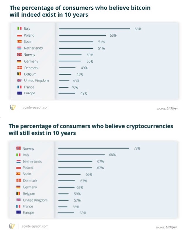 Биржа bitFlyer Europe опрашивала 10 000 европейцев из 10 стран в 2019 и 2020 годах. За год количество людей, уверенных в том, что криптовалюты никуда не денутся в течение следующих 10 лет, выросло с 63% до 66%. При этом в длительное существование биткоина верят лишь 49%, а в его использование для инвестиций — лишь 7%.