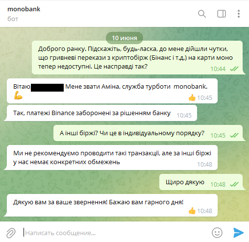 Сегодня стало известно, что крупнейший украинский мобильный банк Monobank заблокировал возможность выводы с Binance на карты, а также «не рекомендует проводить такие транзакции с других криптобирж». Именно такую информацию предоставил представитель поддержки банка: