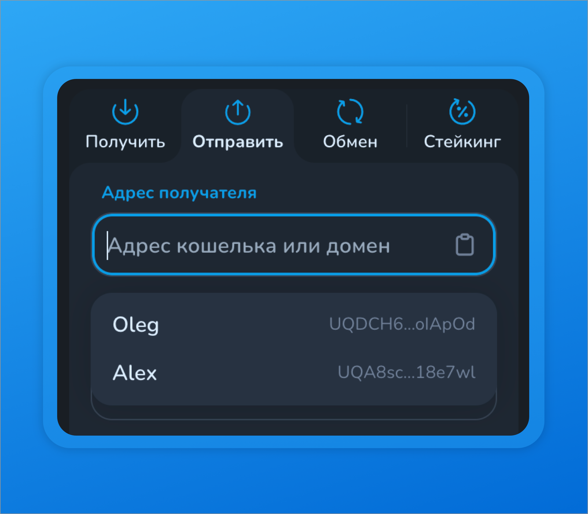 Ещё кошелёк позволяет сохранять адреса на которые вы отправляли TON, это очень удобно, если вы регулярно совершаете транзакции.