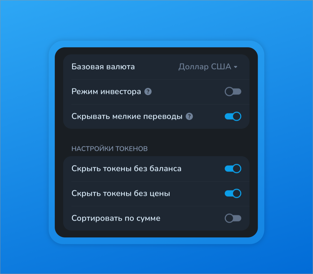Доступен Режим инвестора, позволяющий сфокусироваться на стоимости жетонов, а не на балансе, а также светлая и тёмная тема кошелька для лучшего отображения.