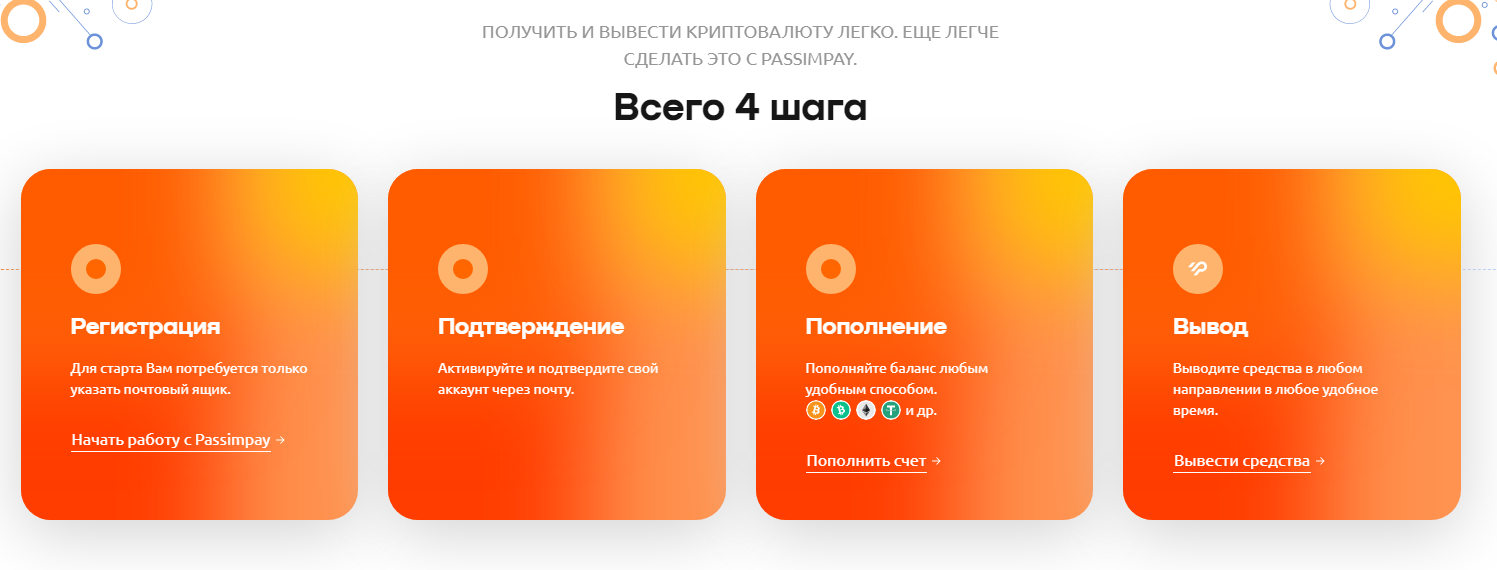 Кроме прочего, PassimPay максимально упростили каждый процесс, чтобы пользователи могли получать, хранить, отправлять и обменивать криптовалюту. И главное — делать это удобно и быстро. Без скрытых комиссий. В любое время и из любой точки мира. В один клик.