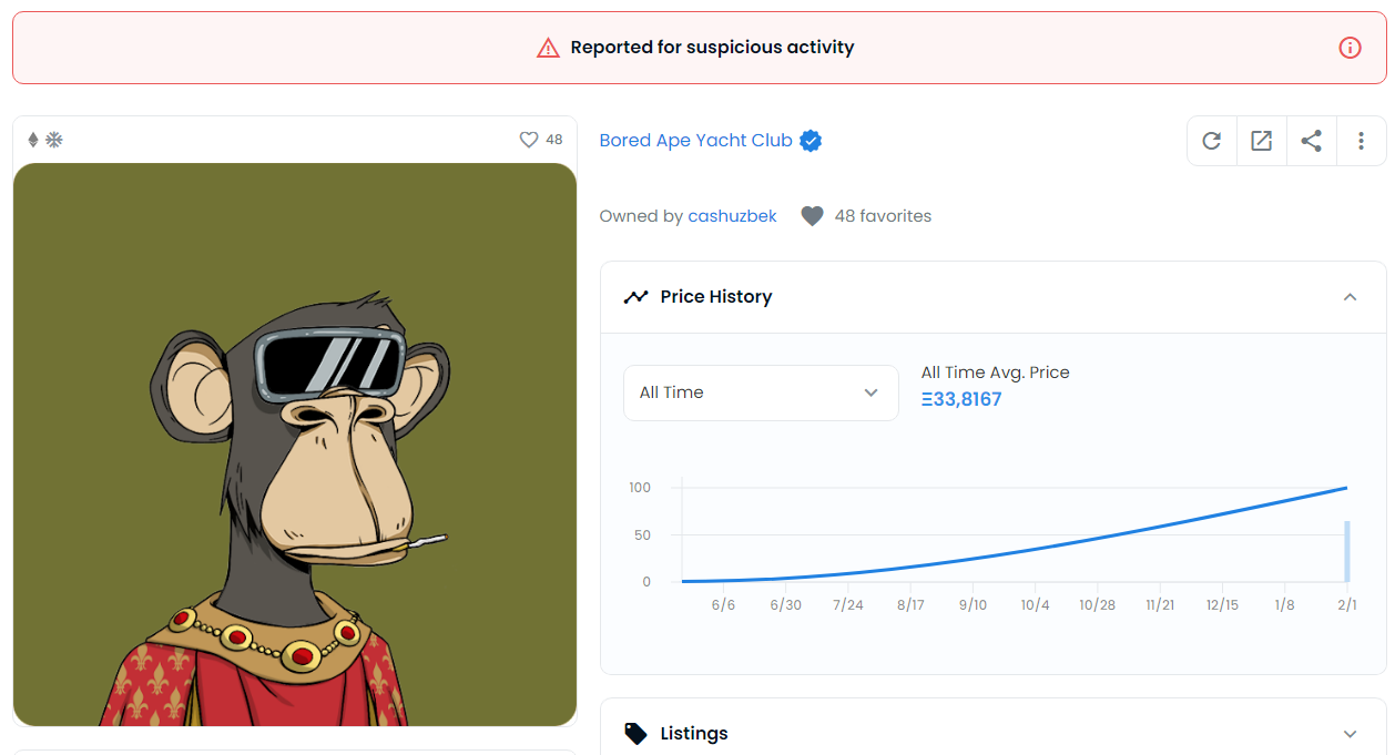 Криптоэнтузиаст купил NFT-обезьяну из знаменитой коллекции Bored Ape Yacht Club (BAYC) за 139.99 ETH (более $400 000) — невзаимозаменяемый токен оказался краденным, его заблокировали и уведомили об этом на площадке Opensea:
