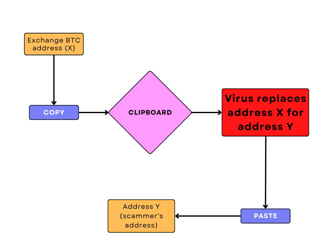 Вредоносная программа срабатывает при каждом копировании в буфер обмена любой строки из букв и цифр, которая напоминает адрес в сети определённой криптовалюты. После копирования адреса вредоносная программа подменяет его в буфере обмена другим адресом, который при этом принадлежит злоумышленнику.