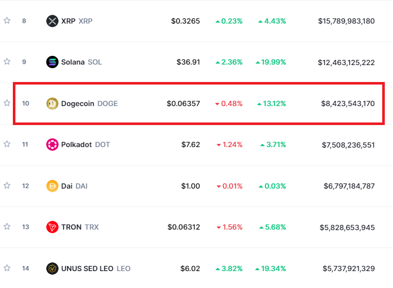 Для примера, капитализация занимающего сейчас 10 место Dogecoin составляет $8.4 млрд: