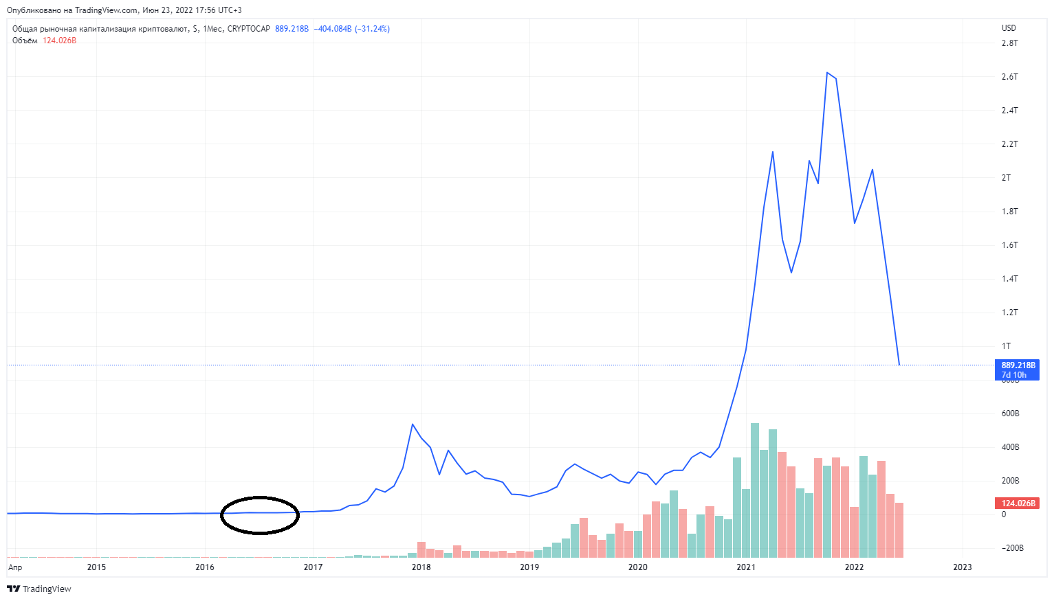 Стоит отметить, что капитализация рынка криптовалют в июне 2016 года составляла всего около $10 миллиардов:
