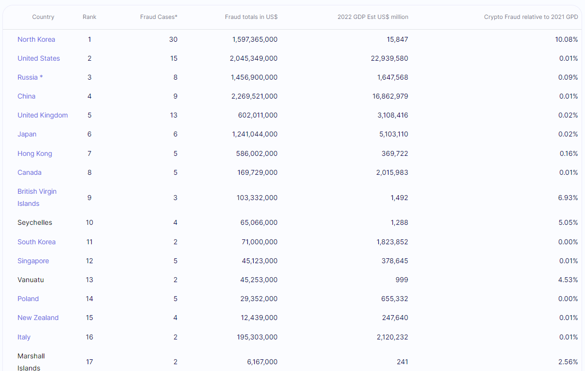 Согласно недавнему исследованию компании Coincub, безусловное лидерство в сфере криптомошенничества застолбила Северная Корея — на данный момент у правительства КНДР есть около 7 000 хакеров, которые приносят деньги в государственную казну, совершая множество успешных кибератак. По разным подсчетам, северокорейские хакеры совершили до 15 крупных криптопреступлений, прибыль от которых составила $1.6 млрд — $2 млрд (за 10 лет).