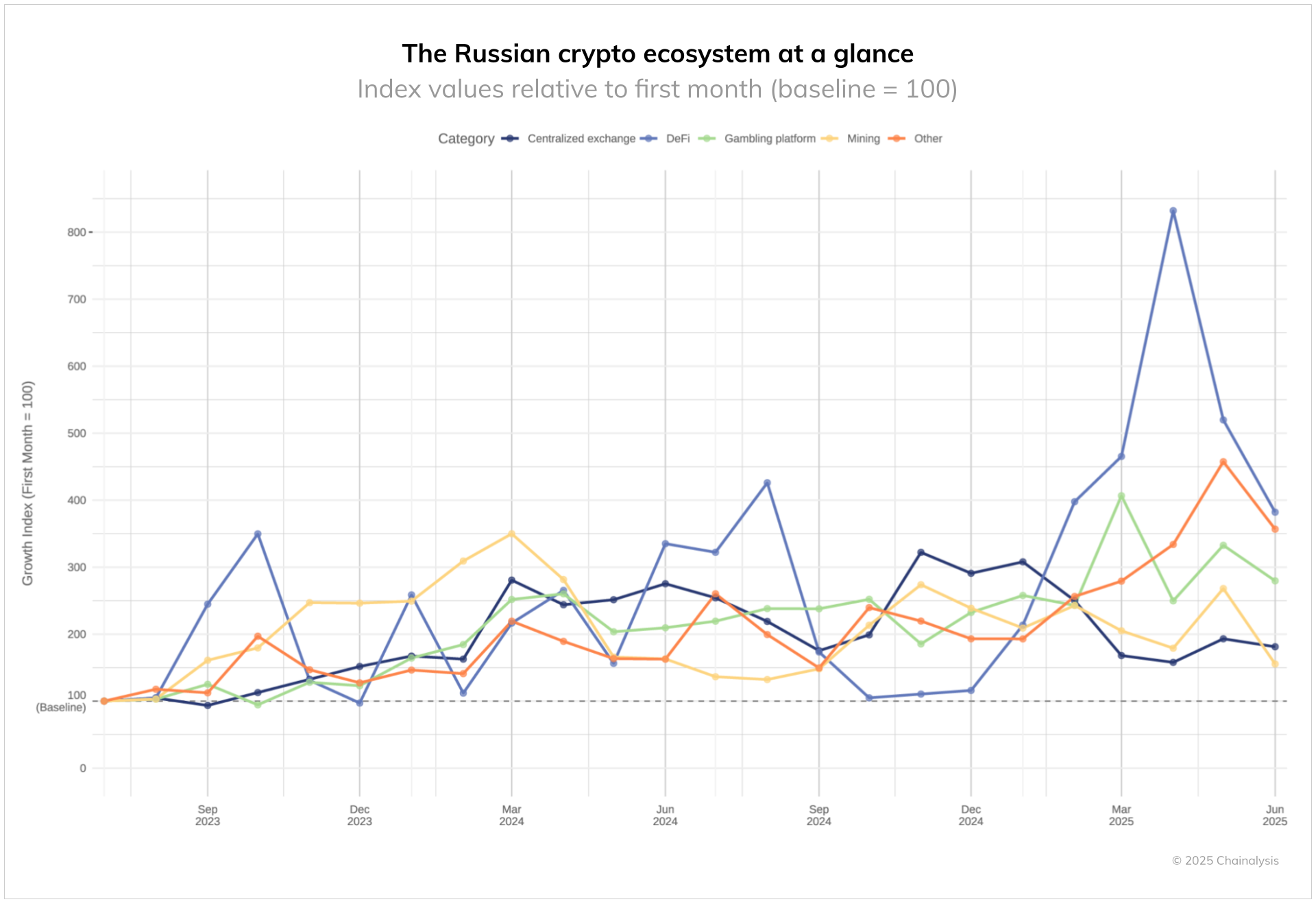 Активное вовлечение банков и крупных компаний в расчёты с использованием криптовалют также способствовало увеличению объёмов рынка. По оценкам Chainalysis, объём трансграничных операций с цифровыми активами в России за первое полугодие 2025 года превысил $12 млрд.
