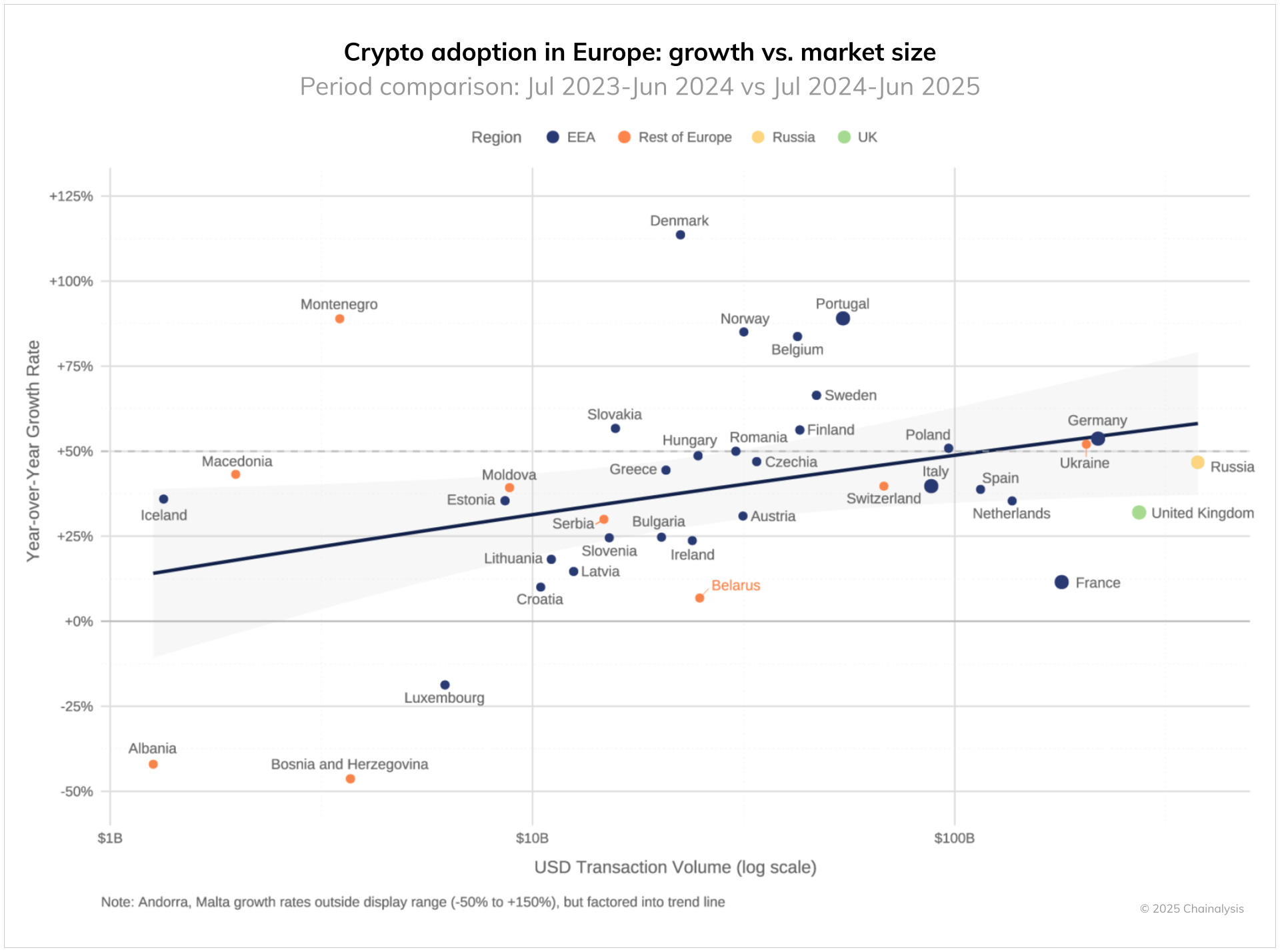 По данным аналитиков, резкий рост обеспечили крупные институциональные переводы — транзакции свыше $10 млн увеличились на 86%, что почти вдвое выше среднего показателя по Европе.