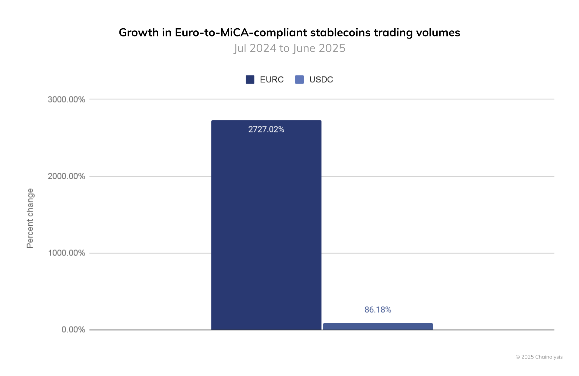Ограничения на использование несертифицированных активов, таких как USDT, вызвали перераспределение ликвидности. Использование EURC от Circle выросло на 2727% за год.