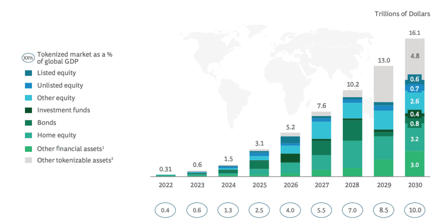 Boston Conulting Group указывают, что до 2030 года общая капитализация RWA может вырасти до $16 трлн и включить акции, государственные облигации, недвижимость, а также активы инвестиционных фондов.