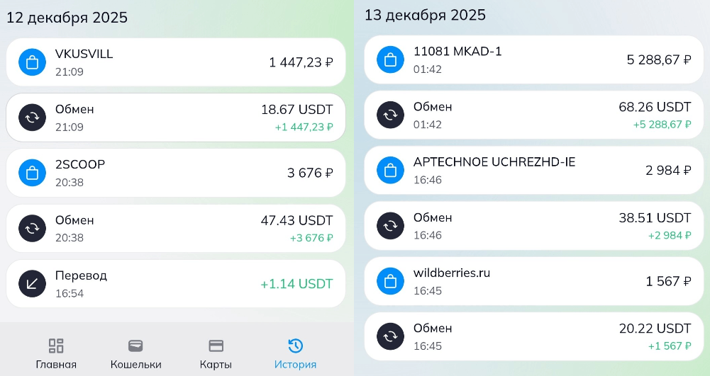 Оплата в магазине или на маркетплейсе проходит как обычная рублевая транзакция. Конвертация происходит автоматически, без предварительного пополнения или ручного обмена. В истории операций это выглядит как стандартные покупки: супермаркеты, сервисы доставки, онлайн-площадки.