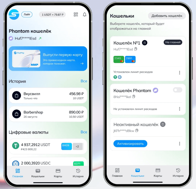 С точки зрения пользователя все довольно приземленно. Есть карта, которую можно добавить в MIR PAY, есть онлайн-покупки, есть QR-платежи через СБП. Разница лишь в том, что источником средств выступает криптовалюта — чаще всего USDT или USDC.