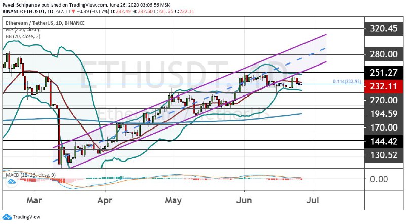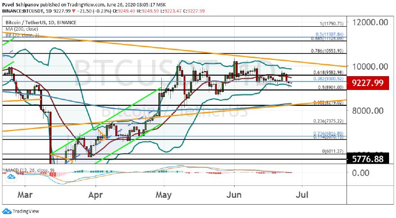 Крипто-аналитики говорят о том, что быки капитулируют под напором медвежьих атак. Однако здесь стоит учитывать сценарий игры китов, который DeCenter разбирал в предыдущих обзорах. Другой причиной падения первой криптовалюты, а вместе с ней и других криптомонет, также стала массовая продажа актива BTC-майнерами. Так, на одной только бирже Bitfinex было продано более 2650 биткоинов. Также не стоит забывать о влиянии традиционного фондового рынка на крипторынок. Рост числа случаев заражения коронавирусом в США, а также перевес голосов в общенациональном опросе в пользу бывшего вице-президента Джозефа Байдена негативно сказались на настроениях инвесторов. В то же время 25 июня стало известно, что Telegram и SEC пришли к мировому соглашению, в рамках которого компания Павла Дурова выплатит $18.5 млн штрафа и вернет инвесторам $1.244 млрд. О том, как эти новости сказались на котировках топовых криптовалют, а также что говорит теханализ об их перспективах — рассказывает DeCenter.