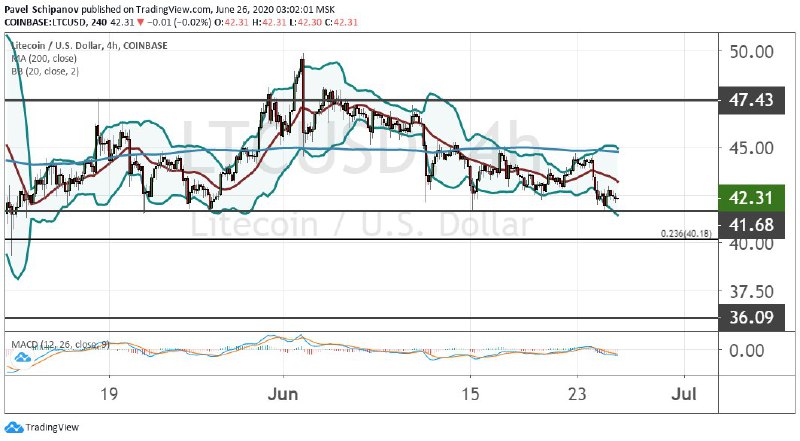 Лайткоин после ретеста линии 200-дневной SMA, проходящей в районе $45, вновь вернулся к границам кластера $40−$42. Формирование бычьей дивергенции на графике и осцилляторе MACD указывает на возможность развития еще одного движения вверх, но приоритет остается за развитием нисходящей волны.