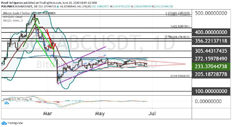 Bitcoin Cash продолжает движение в границах все более сужающегося диапазона, приобретая вид ценовой модели «Треугольник» (ее границы обозначены розовыми линиями на графике ниже). Также котировки BCH продолжают движение в рамках «горизонтального канала» $200−$272, где также расположена линия 200-дневной SMA. Уход ниже $200 позволит котировкам Bitcoin Cash протестировать поддержки в районах $170 и $150, а также маловероятен, но все же возможен уход к $100. В долгосрочной перспективе стоит ожидать прорыва котировками Bitcoin Cash уровня $272, что позволит альткоину устремиться к целям $305, $356 и $400.
