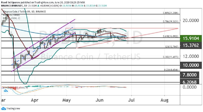 В конце этой недели Binance Coin тестирует нижнюю границу модели теханализа «Восходящий треугольник». Успешное пробитие ее и границ области $15.30−$16 (где проходит линия 200-дневной SMA) позволит котировкам BNB отправиться в нисходящее движение. Победа медведей даст трейдерам протестировать поддержки на уровнях $13.80 и $11.50.